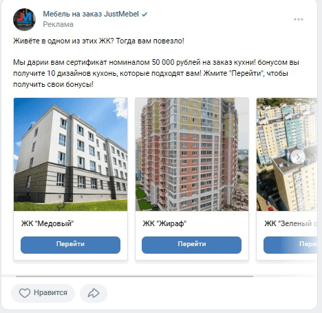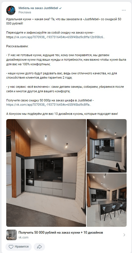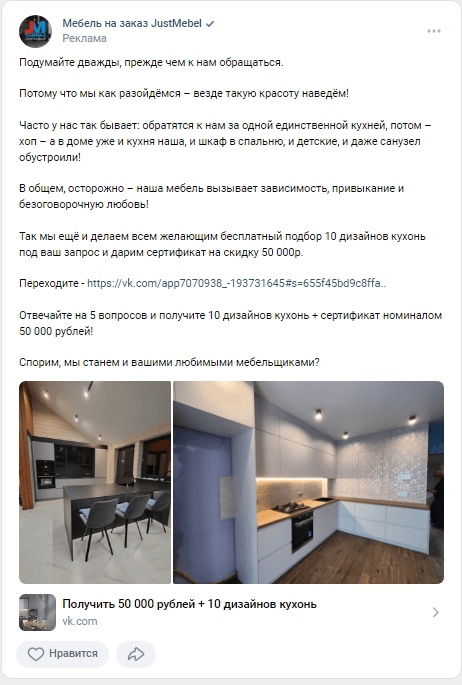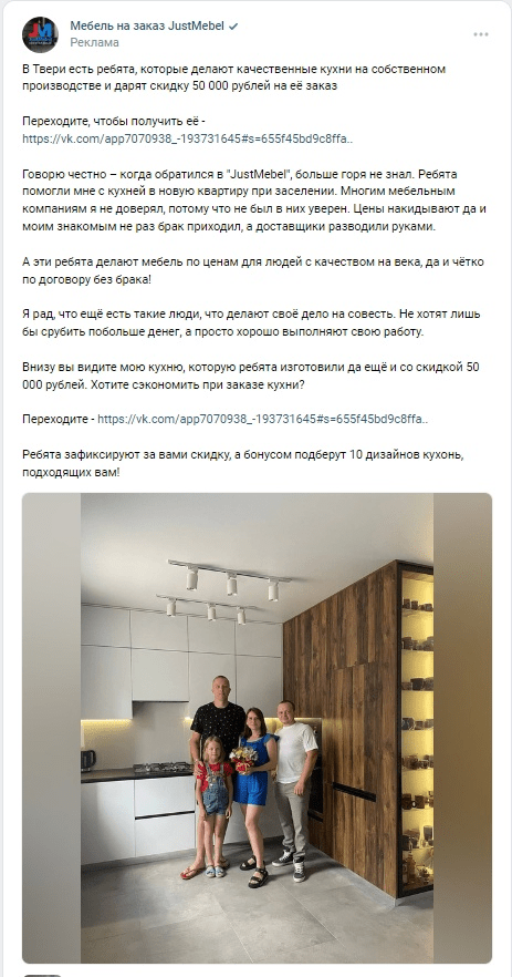 В креативах мы также изменили подход. Меньше использовали медиаматериалов с домами (сегментация на ЖК) и рисунки/чертежи кухонь и больше стали показывать сами кухни, дизайнерские решения и отзывы клиентов. Изменили подход к текстам: открыто озвучивали цены на кухни, чтобы отсекать неплатёжеспособную аудиторию и больше раскрывали наши УТП (Уникальное торговое предложение - то, чем мы отличаемся от конкурентов). Чтобы вы наглядно поняли разницу покажем несколько примеров.
