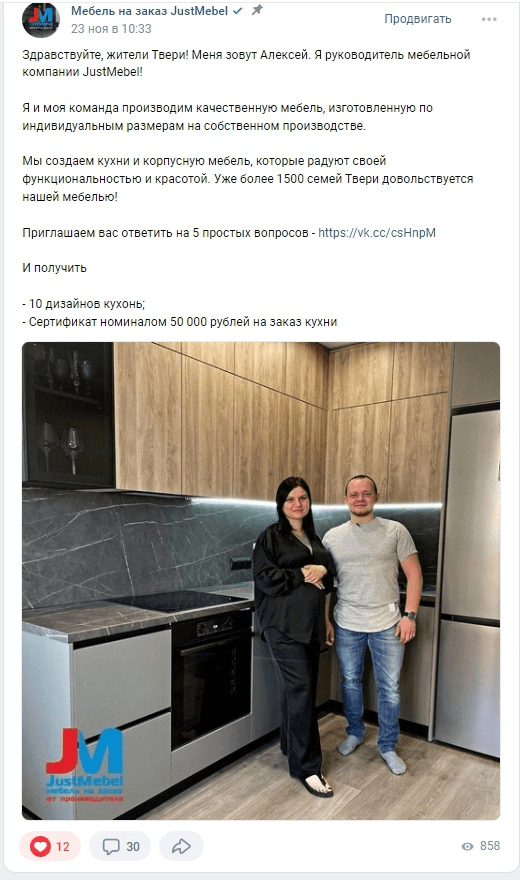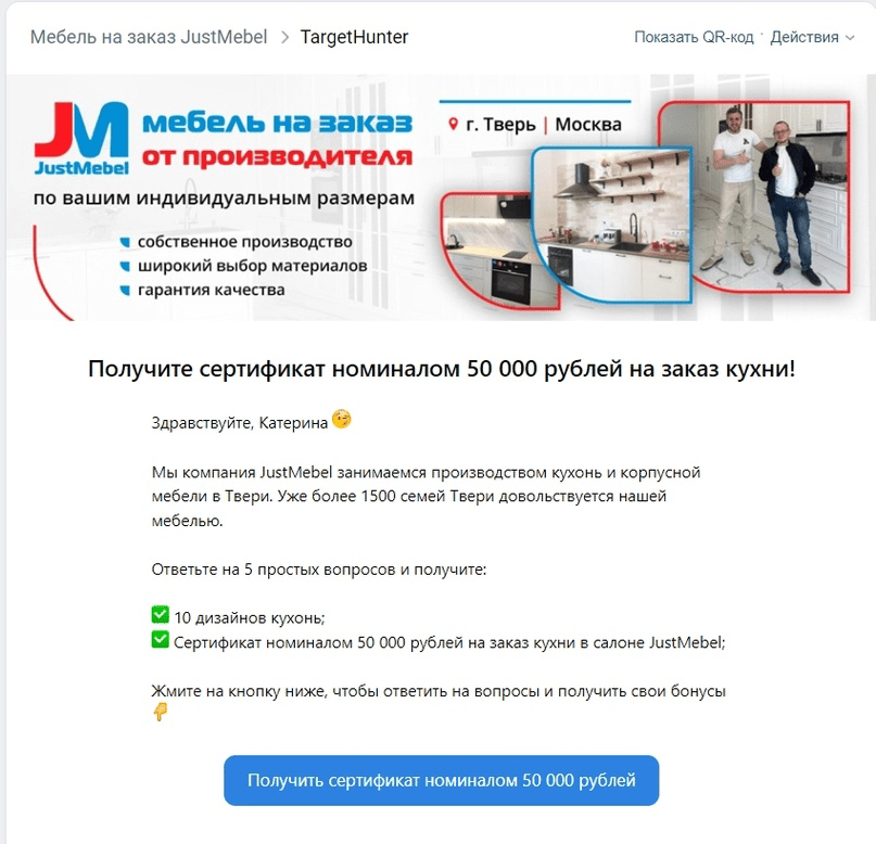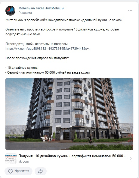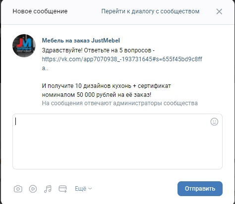 1) На аудиторию, которая ранее писала в сообщество. Мы рассказали ей о новом оффере и призвали подписаться на чат - бот, чтобы зафиксировать его. Таким образом мы выявляли тех, кто всё ещё заинтересован в приобретении кухни.