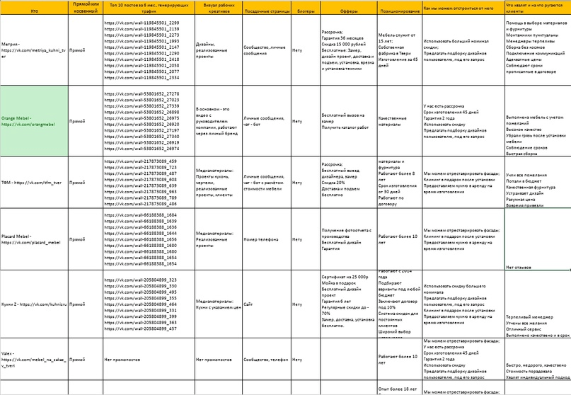Через специализированный сервис нами были собраны и проанализированы топ - 10 конкурентов, которые располагаются в Твери. При анализе мы обращаем внимание на посты, которые генерируют трафик, какие посадочные страницы используют конкуренты, какие офферы (спец.предложения) фигурируют в рекламе, что хвалят клиенты и самое главное, как мы можем отстроиться от конкурента. Что мы можем предложить такое, что не используют другие.