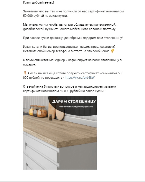 Во 2 рассылке заказчиком был предложен оффер со столешницей в подарок, при заказе кухни “до конца месяца”, что позволило дополнительно замотивировать аудиторию оформить договор “прямо сейчас”