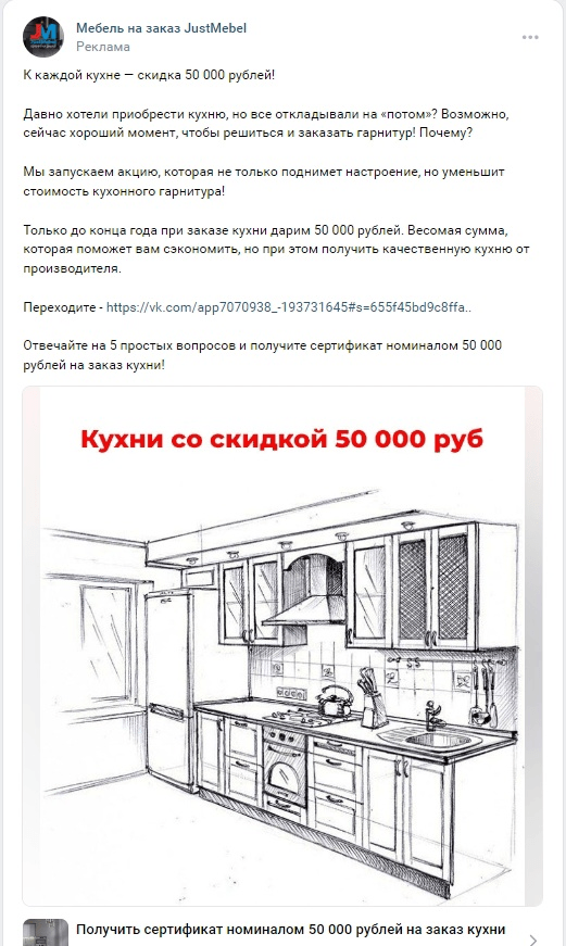 После анализа, нами было предложено использовать дизайны кухонь под запрос клиента в качестве лид - магнита, а в качестве оффера предлагать пользователям сертификат, номиналом 50 000 рублей, которым пользователь мог оплатить не более 10% от стоимости кухонь. Этим мы планировали переманивать аудиторию конкурентов, т.к никто из них не использовал такой оффер + лид магнит.