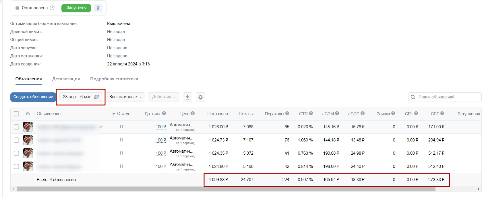 Период работы рекламы: 23 апреля 2024 - 6 мая 2024