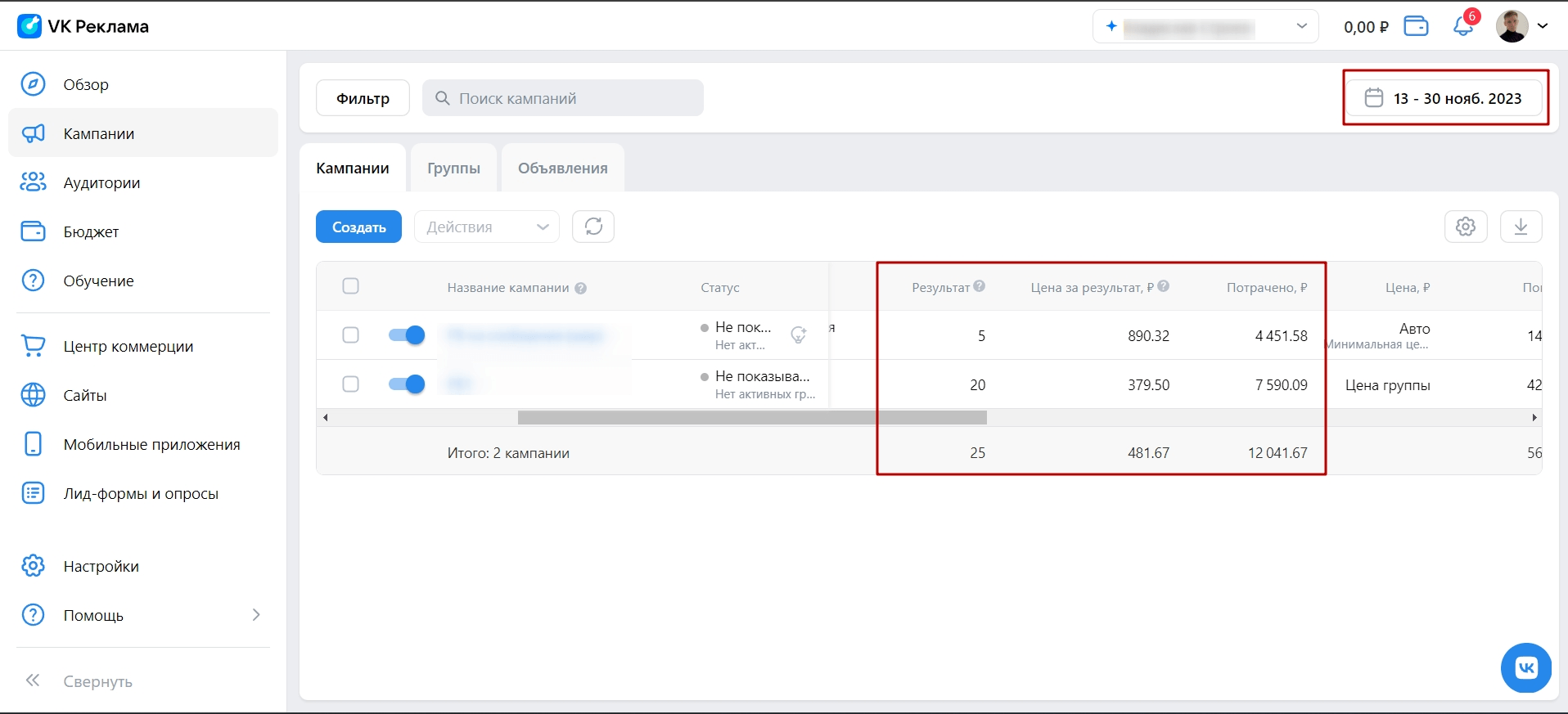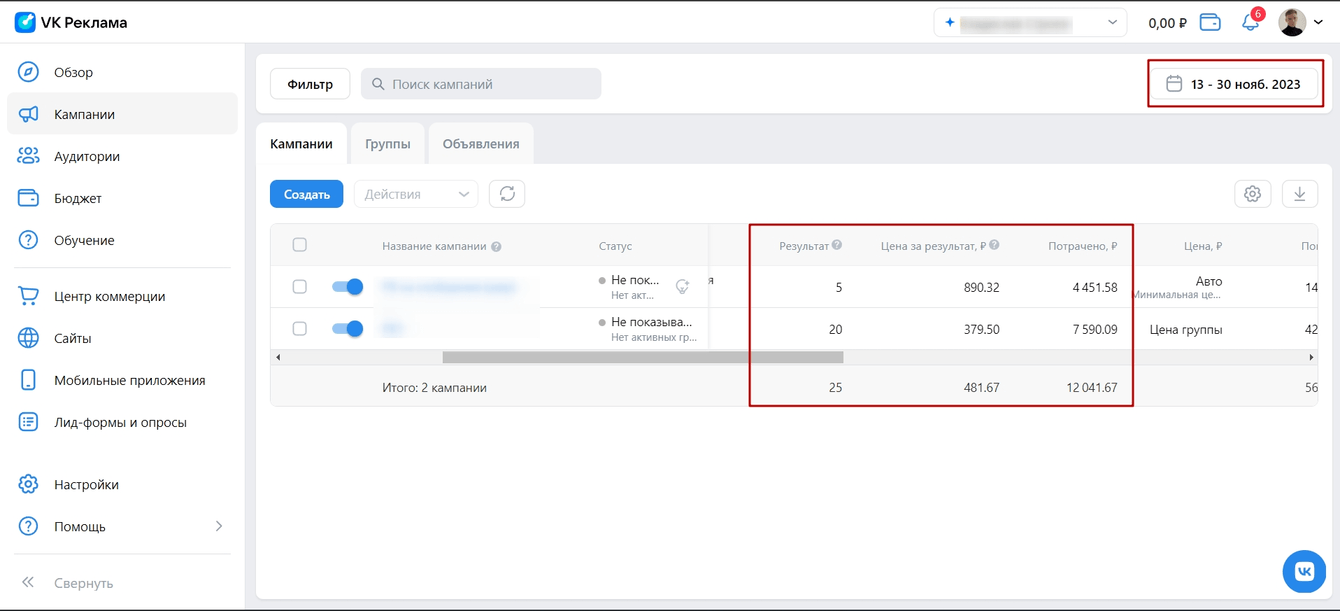 Результаты рекламы в новом кабинете:
