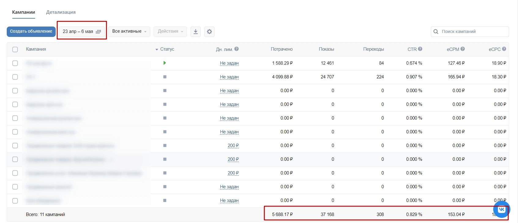 Результаты рекламы в старом кабинете: