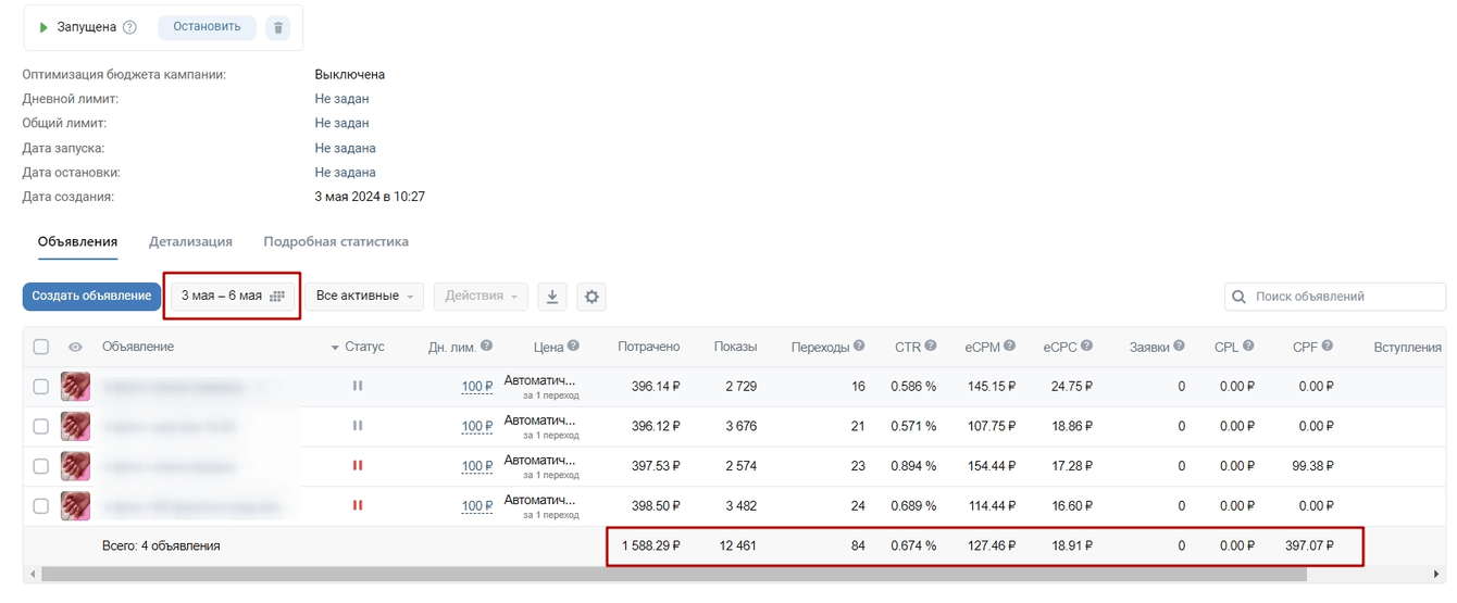 - запуск с перерывами в новом и старом рекламной кабинете.