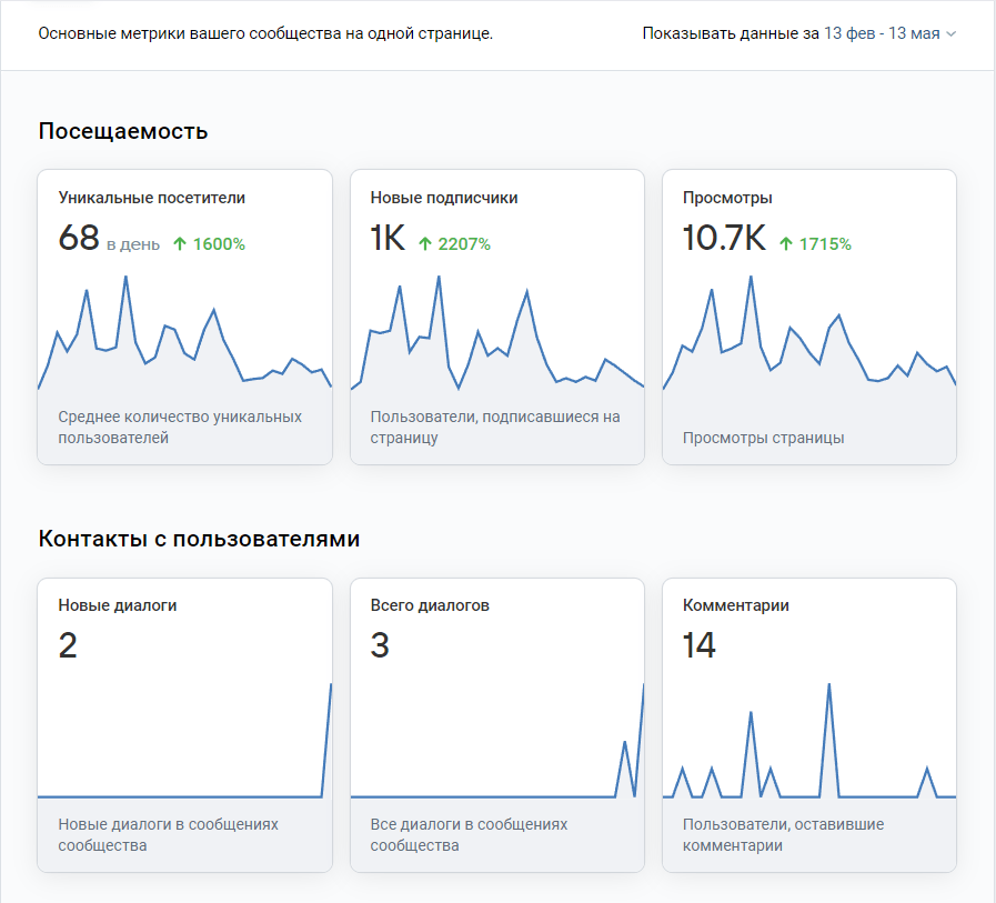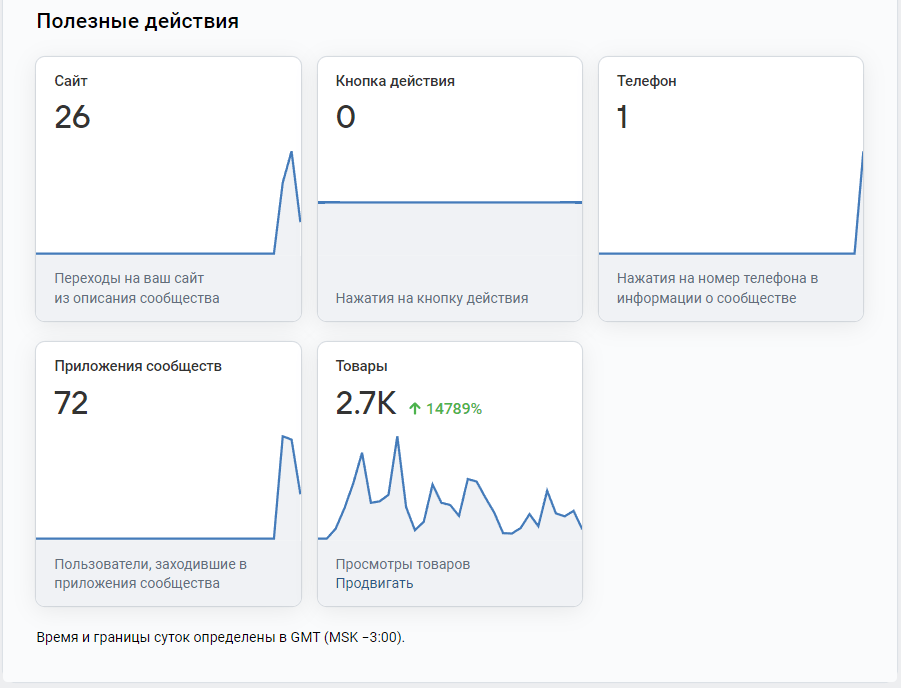 Важно перед просмотром скринов оговориться, что рекламный кабинет подтягивает в статистику только те подписки и сообщения, которые совершены в первые 10-15 минут после перехода по рекламе. То есть если человек написал или подписался позже, то на скрин он не попадет, но фактически перешел с рекламы. Поэтому мы считаем всех новых подписчиков сообщества за период, зная, что других настолько активных источников трафика у них нет (только рекомендации и карты, что не сильно влияет на показатель подписок)