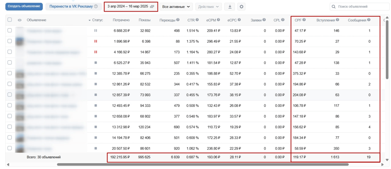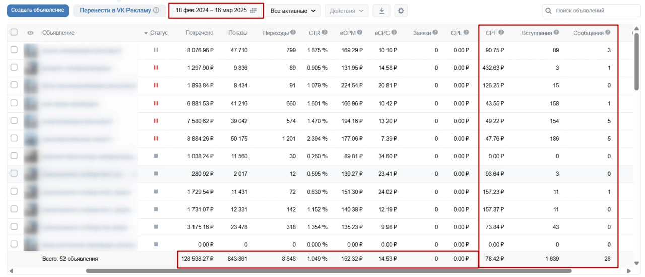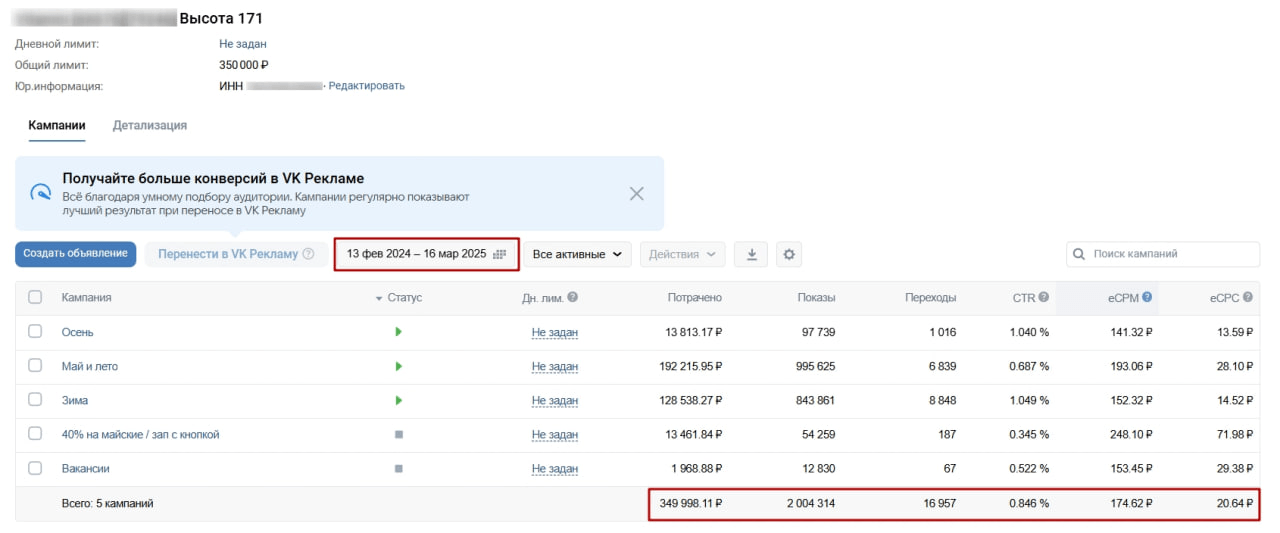 Скриншот рекламного кабинета за весь период работы: