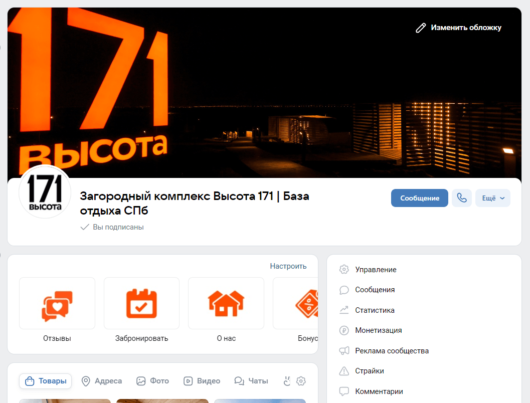 Они установили на обложку фото ночной базы, на которой ярко видно название "171 высота" и подсвеченные входные группы каких-то строений. Мы знаем, что это бани, а за ними огни Санкт-Петербурга, но посетители сообщества, по моему мнению, этого не понимают и ничего не видят (скрин ниже).