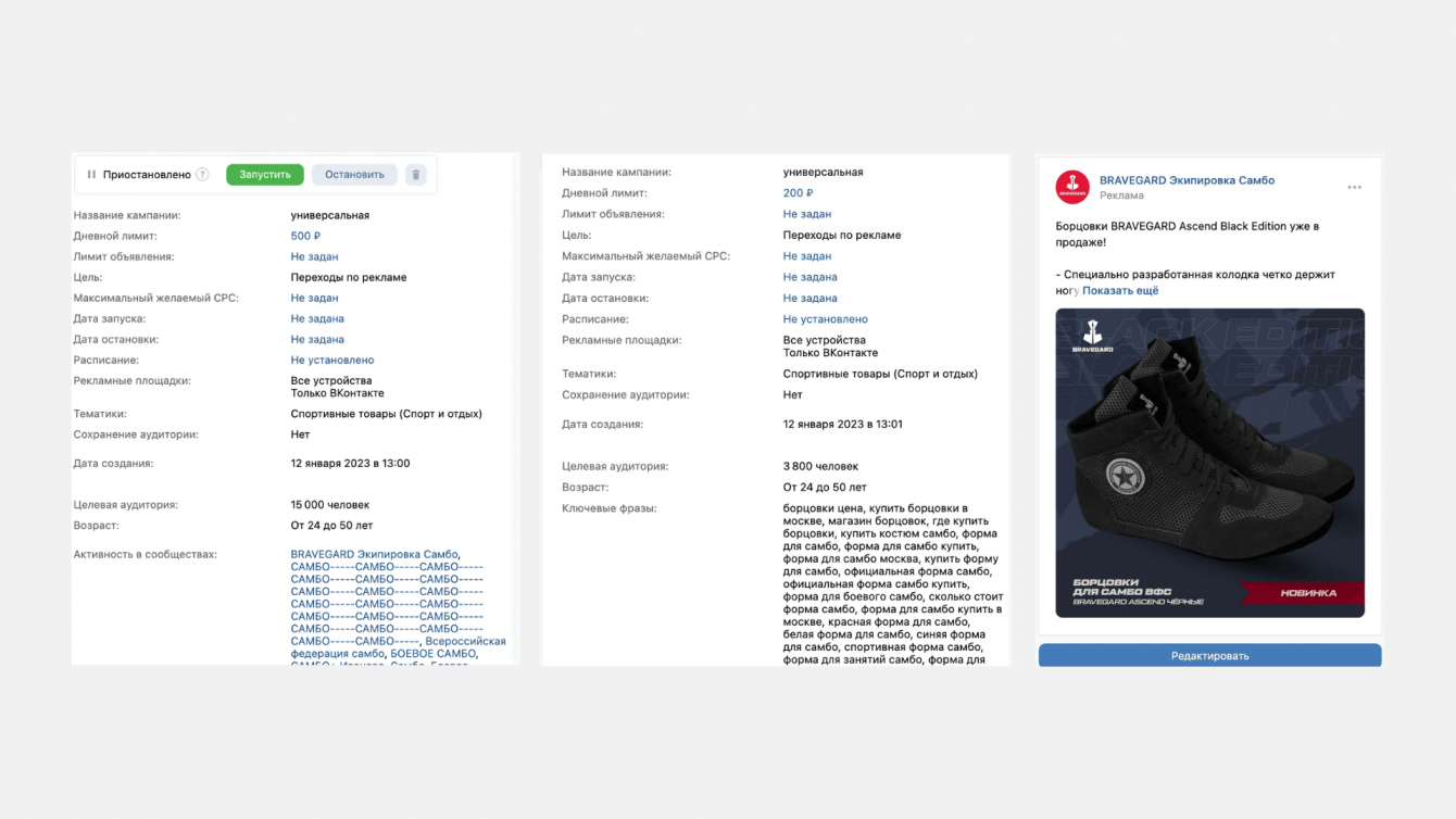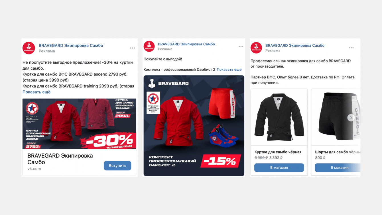 При этом разбиваем показ разных категорий по разным инструментам, например, шорты крутим в универсальной записи, экипировку в видеоформате, в каруселе ветровки, тем самым скорее находим, какой товар подойдет вашему клиенту.