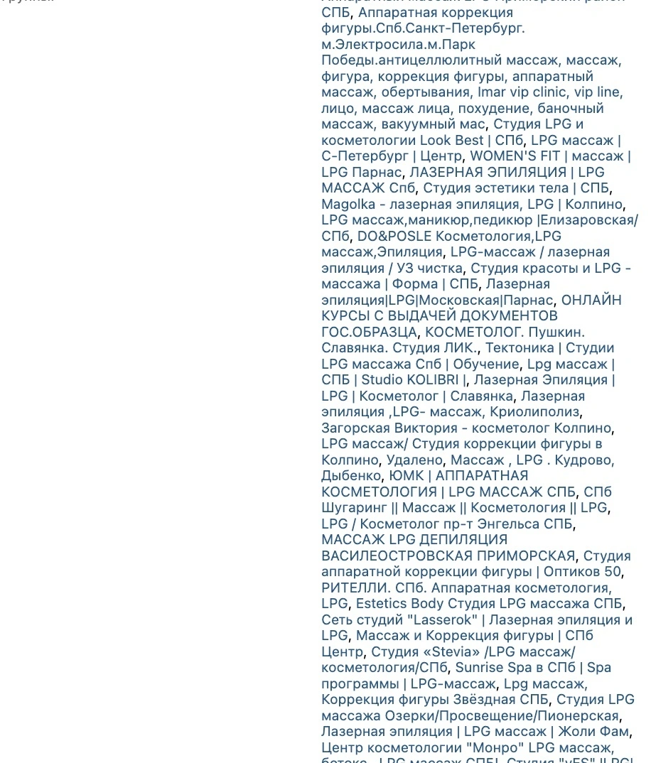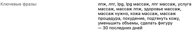 В качестве поиска аудиторий собрали ключевые слова из настроек рекламного кабинета: лпж, лпг, lpg, lpg массаж, лпг массаж, услуга массаж, массаж лпж, здоровье массаж, массаж нужно, кожа массаж, массаж процедура, похудение, подтянуть кожу, уменьшить объемы, сделать фигуру