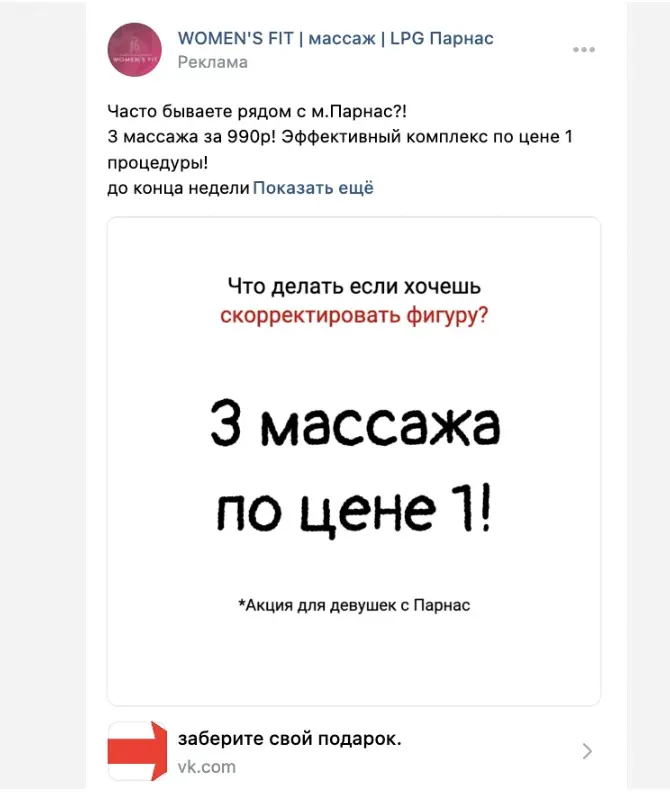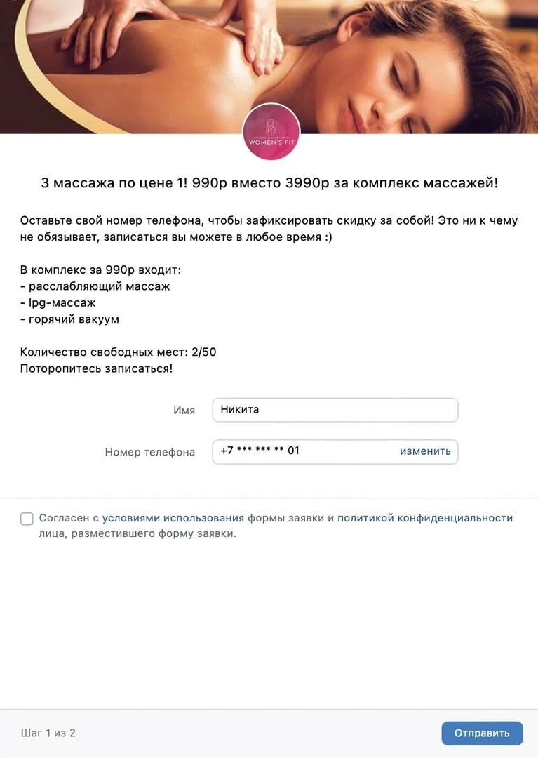 Через брифинг разработали и согласовали совместно с руководительницей рекламное предложение и оффер - это комплекс за 990р входит:- расслабляющий массаж- lpg-массаж - горячий вакуум.