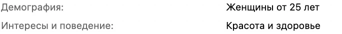 Также узнали у клиента более подробно про целевую аудиторию, что в основном это:Девушки. От 24-50. Интересует север СПб, а именно станция метро Парнас. Интересы похудение, спа, красота, Бьюти. b2c. Достаток, средний, выше среднего