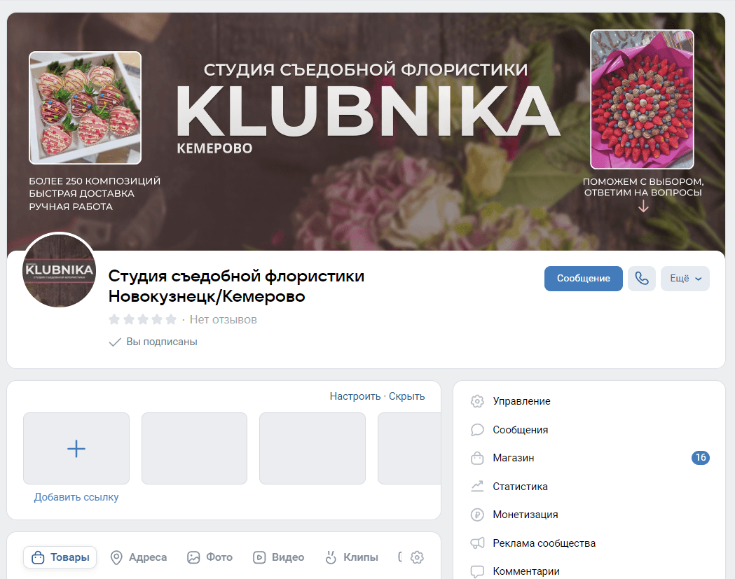 В сообществе были неплохо упакованы товары, был аватар и обложка, разработанная давно и не соответствующая действительности, в частности, город. тестовый трафик мы должны были направить на Новокузнецк, а в обложке указано Кемерово. Разделы меню отсутствуют, закрепленный пост подготовлен не был