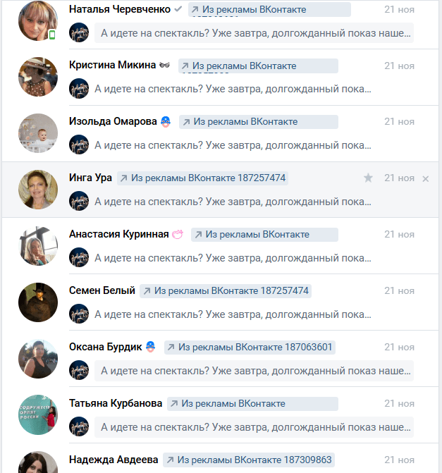 На скриншоте видно метки, указывающие на то, что человек пришел с рекламы, а также одинаковое сообщение от нас - рассылка перед спектаклем.