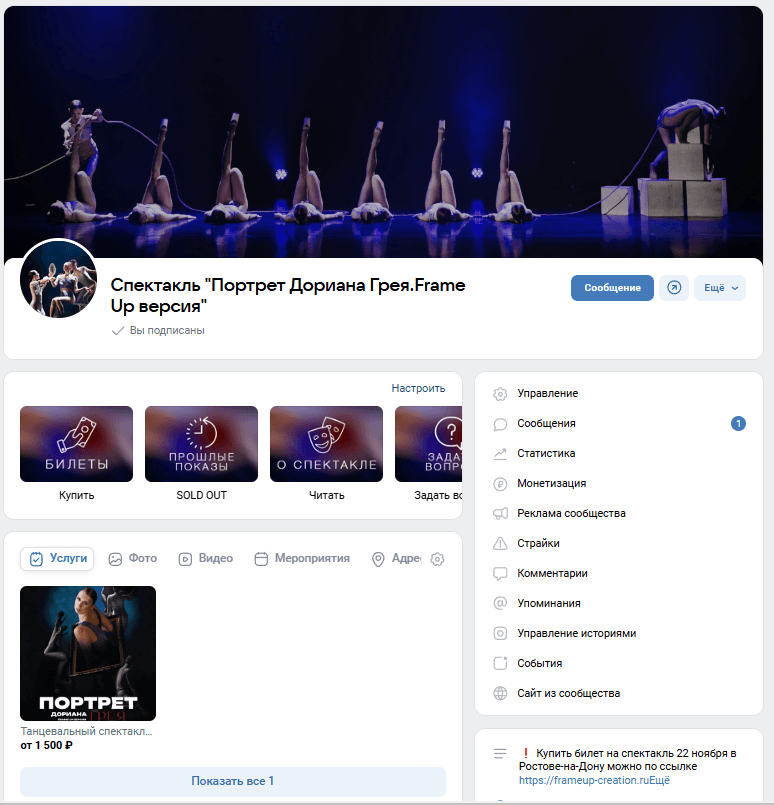 У проекта был сайт, на котором продажи осуществлялись сразу через сервис Intickets. Также у танцевального спектакля уже было создано сообщество с 300 подписчиками, использовавшееся для предыдущих показов. Однако данное сообщество было слабо упаковано.