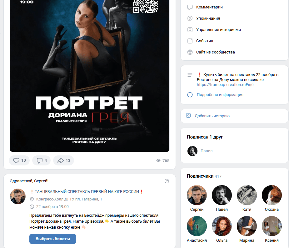 У проекта был сайт, на котором продажи осуществлялись сразу через сервис Intickets. Также у танцевального спектакля уже было создано сообщество с 300 подписчиками, использовавшееся для предыдущих показов. Однако данное сообщество было слабо упаковано.