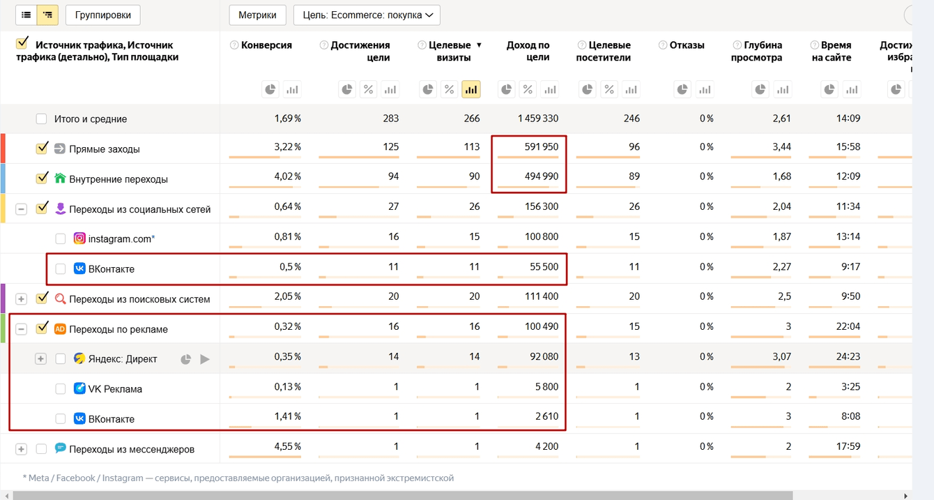 К сожалению, мы не можем точно определить, сколько именно продаж из наших источников попало во внутренние переходы. Игнорировать данные о внутренних переходах также невозможно, поскольку они составляют около полумиллиона рублей в билетах, полученных именно из этого источника. В связи с этим мы решили пропорционально распределить внутренние переходы между всеми источниками. У нас есть продажи из прямых заходов, Instagram, ВКонтакте, поисковой выдачи и Яндекс.Директа. Мы вычислили пропорции, в соответствии с которыми люди покупают из этих источников. Продажи, осуществленные через внутренние переходы, были распределены по этим пропорциям между различными источниками. Поэтому в итогах нашей работы я указываю сумму продаж билетов, включая добавленную долю из внутренних переходов, рассчитанную по установленным пропорциям.