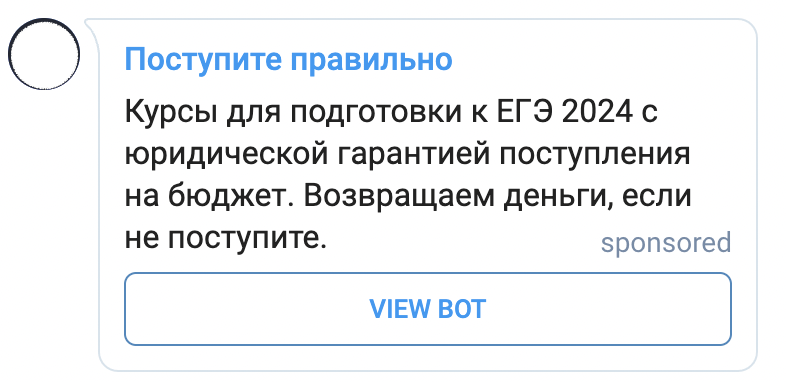 1. В первую очередь мы тестировали оффер с опросом внутри бота. Пример рекламного объявления ниже: