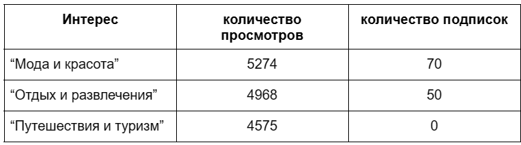 Было выявлено, что ключевые интересы целевой аудитории - это “Мода и красота”, Сопутствующие интересы - “Отдых и развлечения”. По итогам теста, также выявлено, что интересы “Путешествия и туризм” не являются перспективными в данном направлении.
