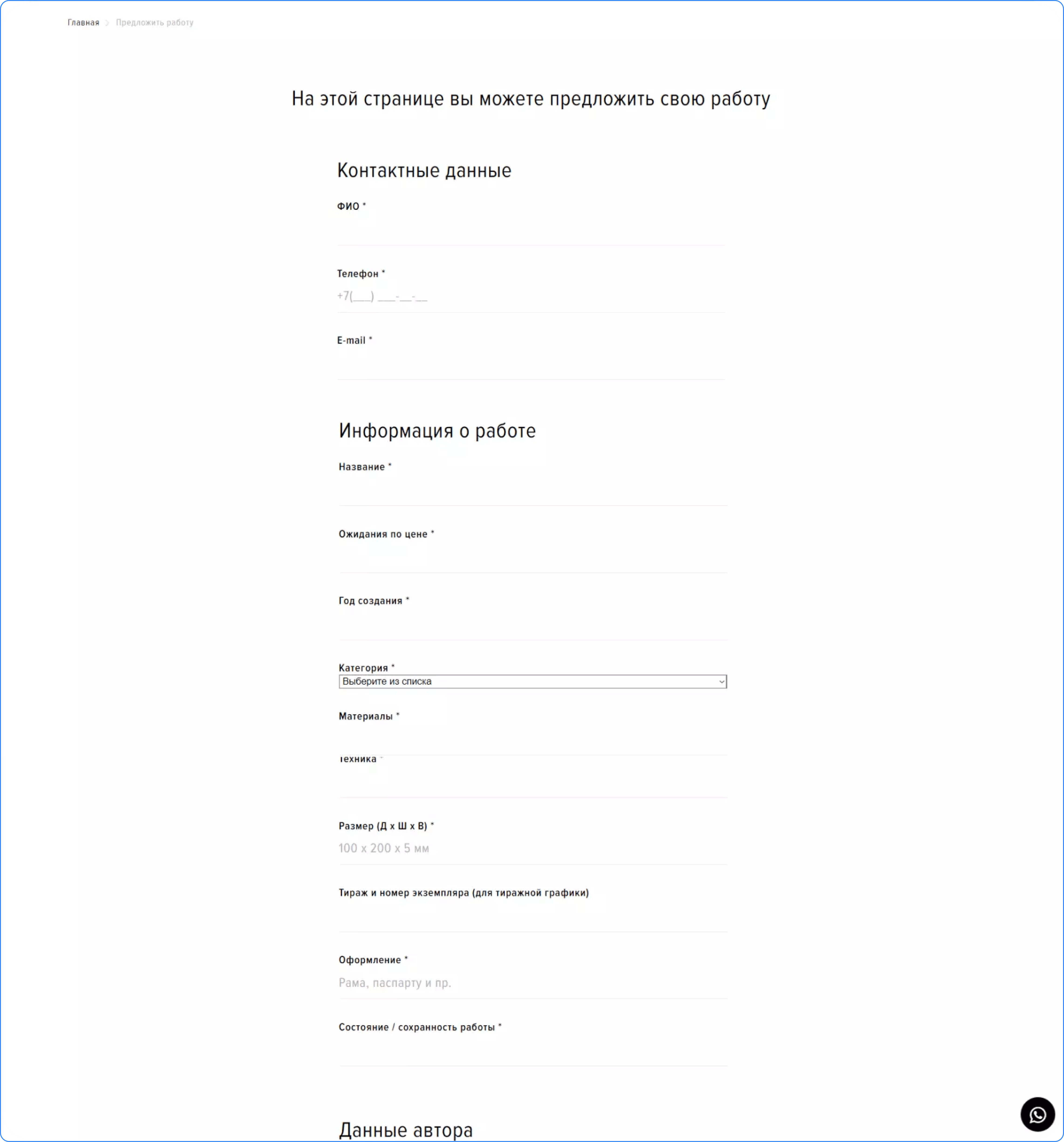 Сделать это можно очень быстро и просто благодаря разработанному нами функционалу. Нажимая на кнопку «продать работу» на главной странице, пользователь попадает на форму, где ему предлагается подробно рассказать об арт-объекте, приложить его фотографии и скан экспертизы.