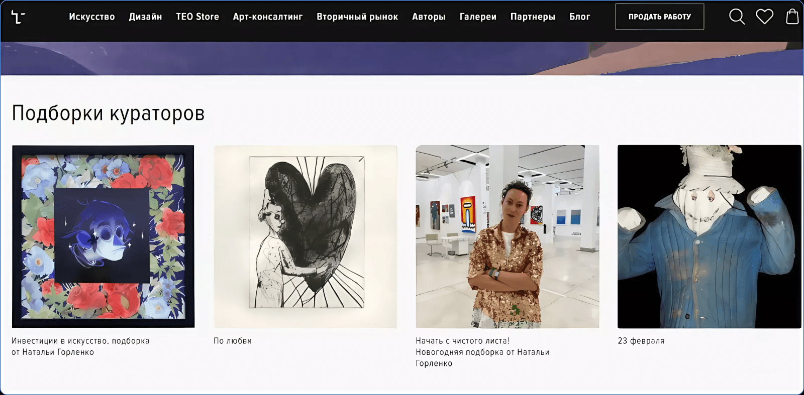 Предусмотрели функцию показа повторным посетителям сайта новых подборок от кураторов и самые свежие поступления работ от авторов и коллекционеров. Первичные посетители видят слайдер, который знакомит их с порталом.