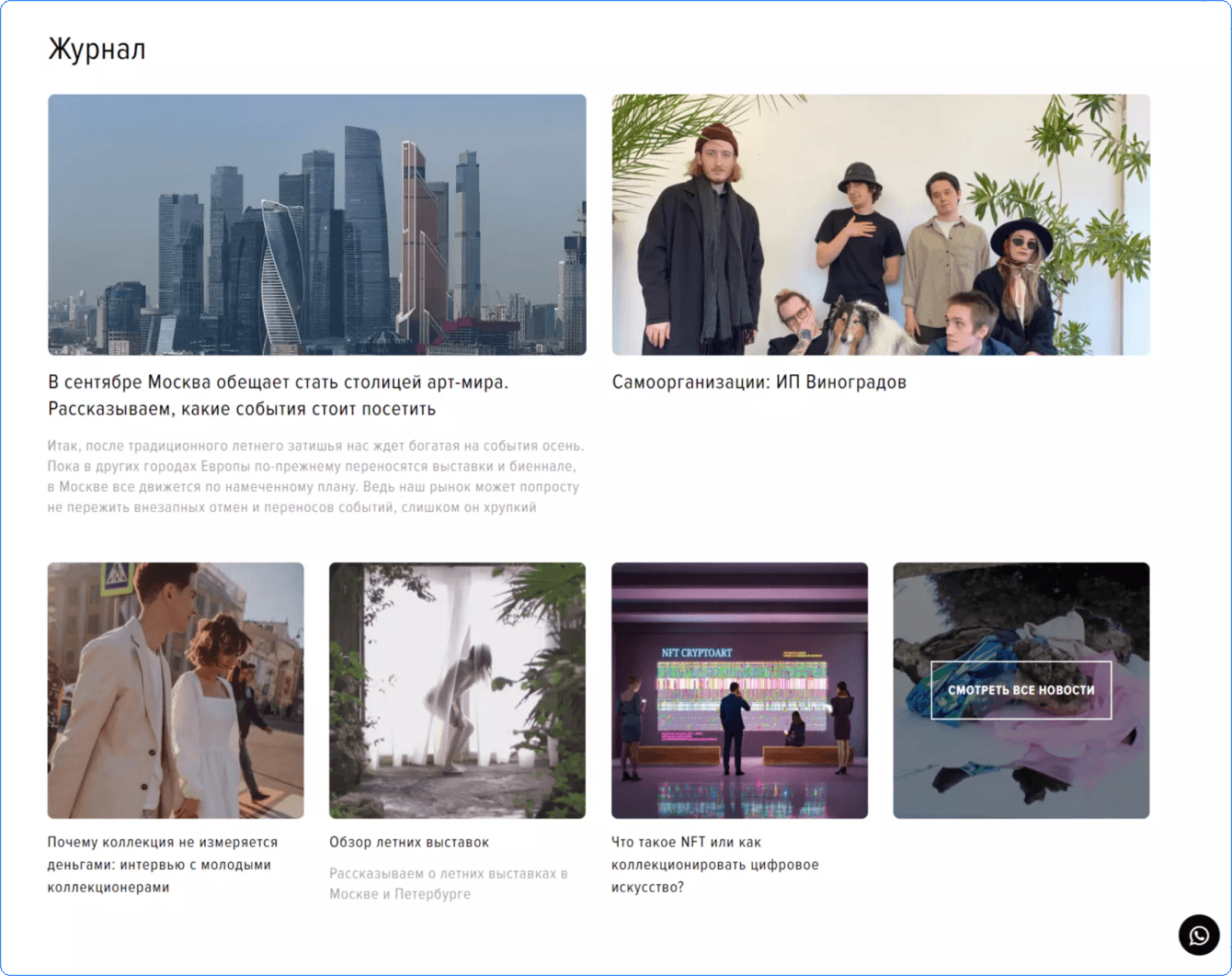 В нижней части сайта разместили блоки с новостями из мира искусства и экспертными статьями, что позволило создать на портале атмосферу арт-тусовки и дало возможность предоставить ценителям современного искусства максимум информации, связанной с новыми именами современных художников, состоянием арт-рынка, актуальными новостями.