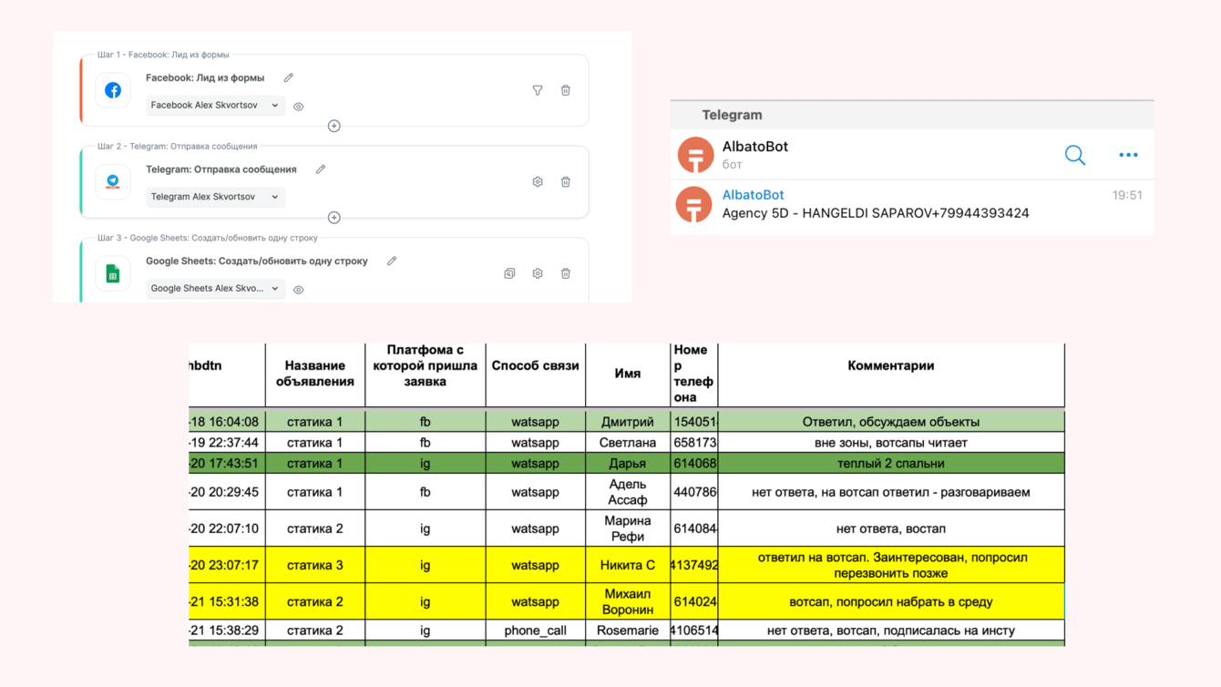Настроили автоматическую выгрузку Лидов через сервис Альбато, чтобы заявки сразу падали в Телеграм клиенту и автоматически выгружались в Google таблицу.