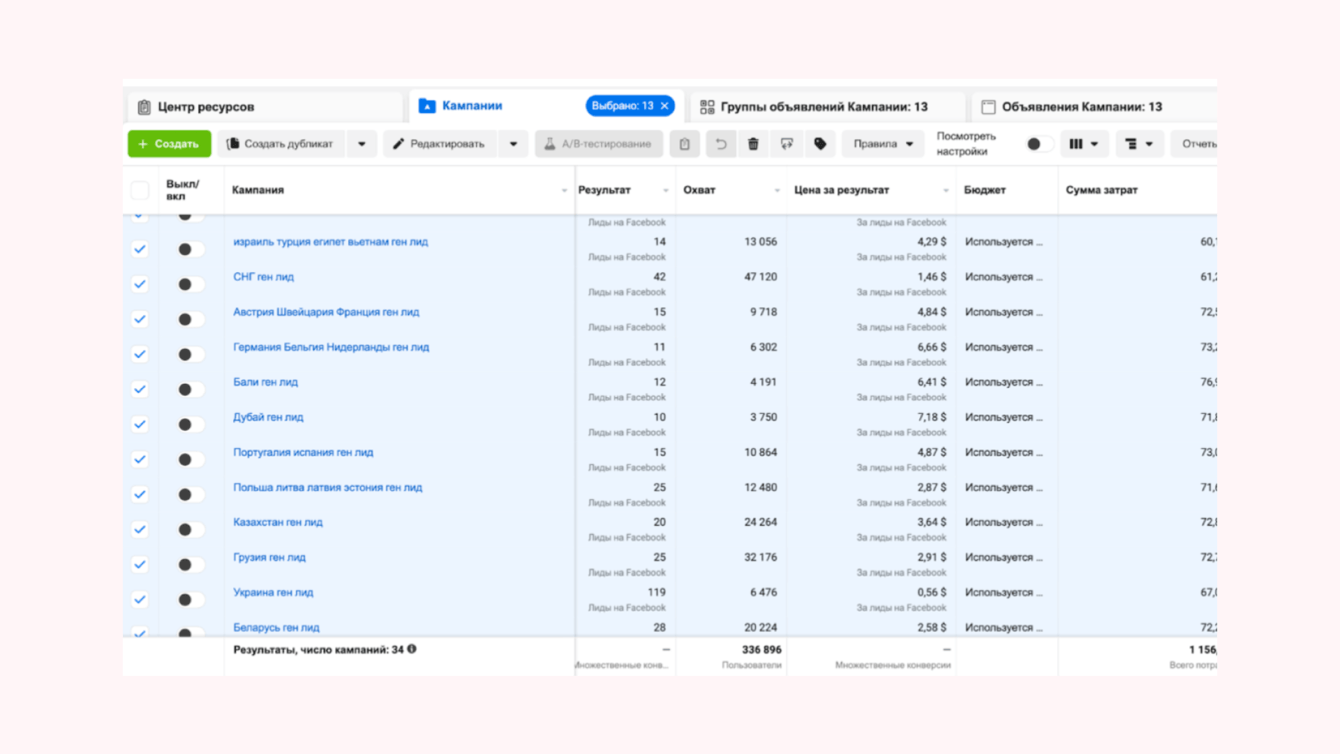 Так как клиент часто сталкивался с блокировками, подготовили несколько запасных рекламных аккаунтов. Чтобы можно было без задержек перенести рекламные кампании.