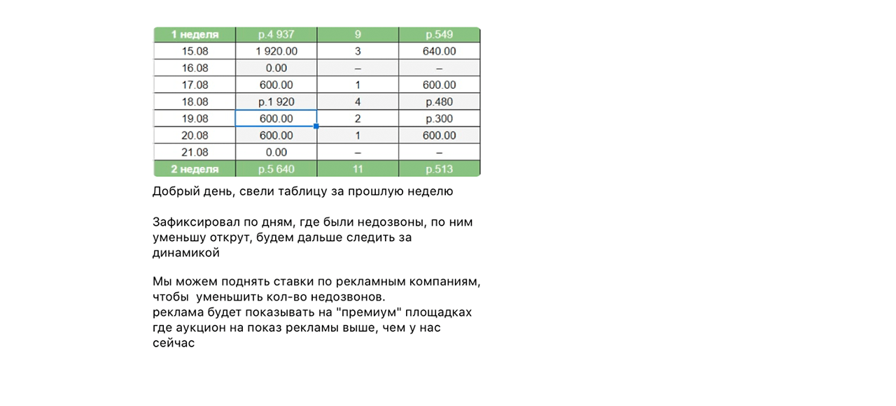 Из 7 заявок, мы видим, что получили клиента стоимостью 3 500 рублей на продукт с чеком 35 000 рублей. Но процент недозвонов довольно-таки высокий ±42%