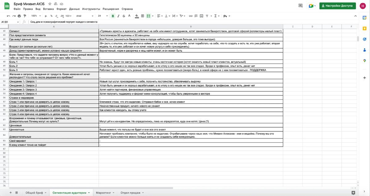 Выделили сегмент студентов выпускных курсов 23+, которые не хотят 10 лет понемногу нарабатывать опыт и связи и не понимают, куда трудоустроиться. Т. к. мы были в курсе, что у Михаила своя юридическая компания, было предложено открыть возможность прохождения практики в определенном тарифном пакете, а также усилить фокус на трудоустройстве и раскрыть регалии Михаила для доверия.