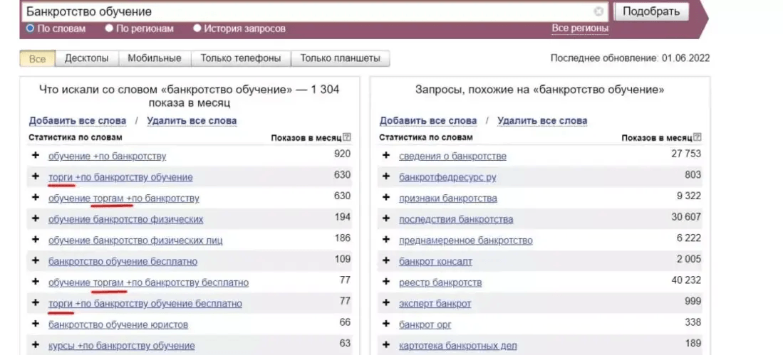 Честно скажу, что на старте, внутри команды, был вопрос брать или не брать проект в работу. Запросов по Яндекс Wordstat было мало на обучение, а те, что были, сильно пересекались с услугами по банкротству.