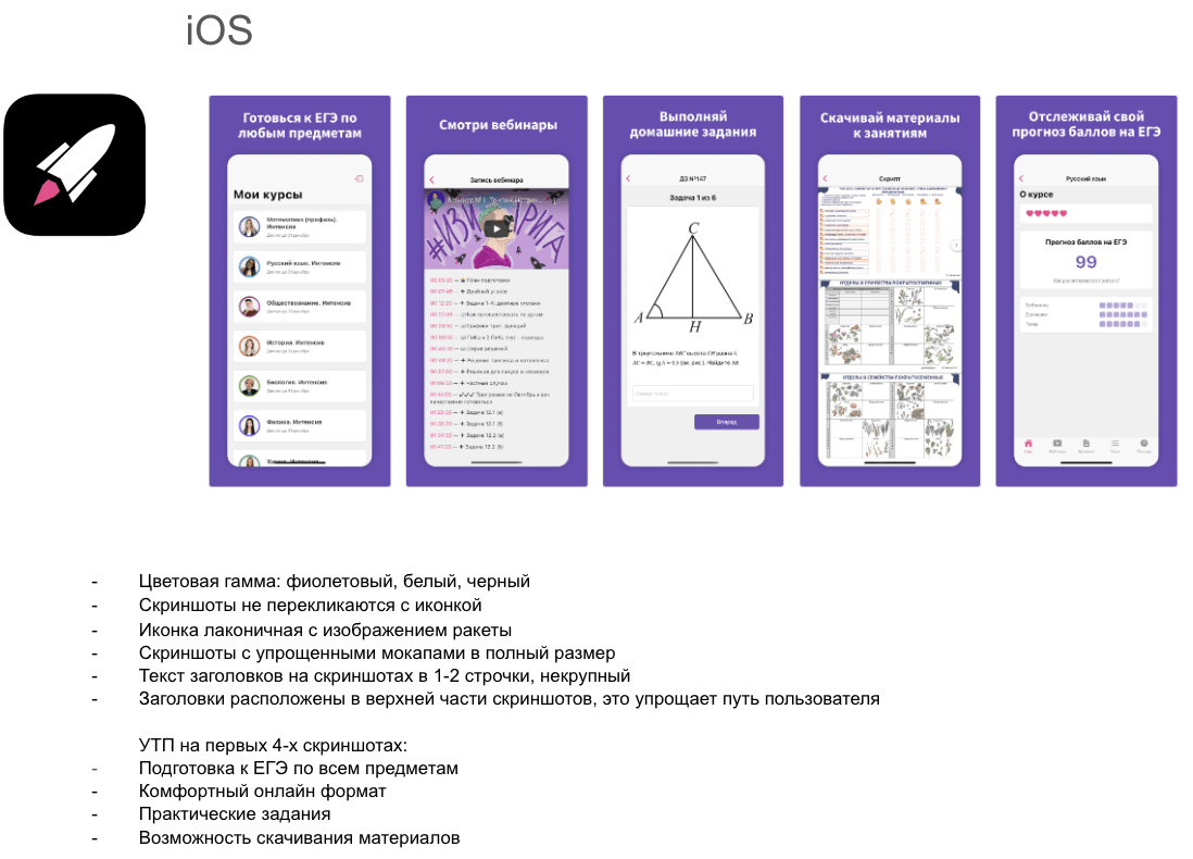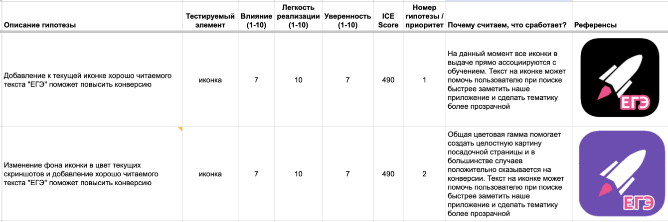 На базе визуального аудита мы выделяем основные гипотезы, проверив которые, сможем с большей долей вероятности увеличить конверсию из просмотра карточки приложения в установку. В случае с «Турбо ЕГЭ» мы наметили несколько гипотез для дальнейшего А/В-тестирования. Вот некоторые из них: