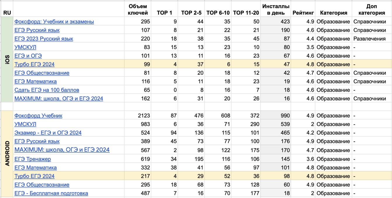 Анализ конкурентов «Турбо ЕГЭ» по объёму ключевых запросов, установкам, рейтингу и категориям