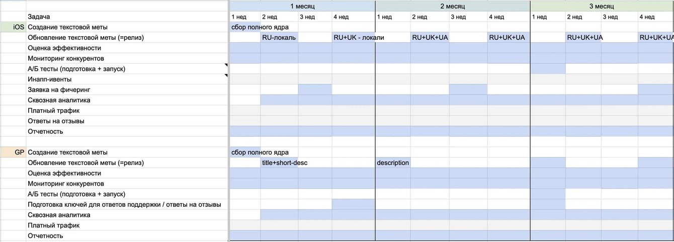 — мониторили изменения и обновляли метаданные раз в две недели в App Store и раз в три-четыре недели в Google Play.