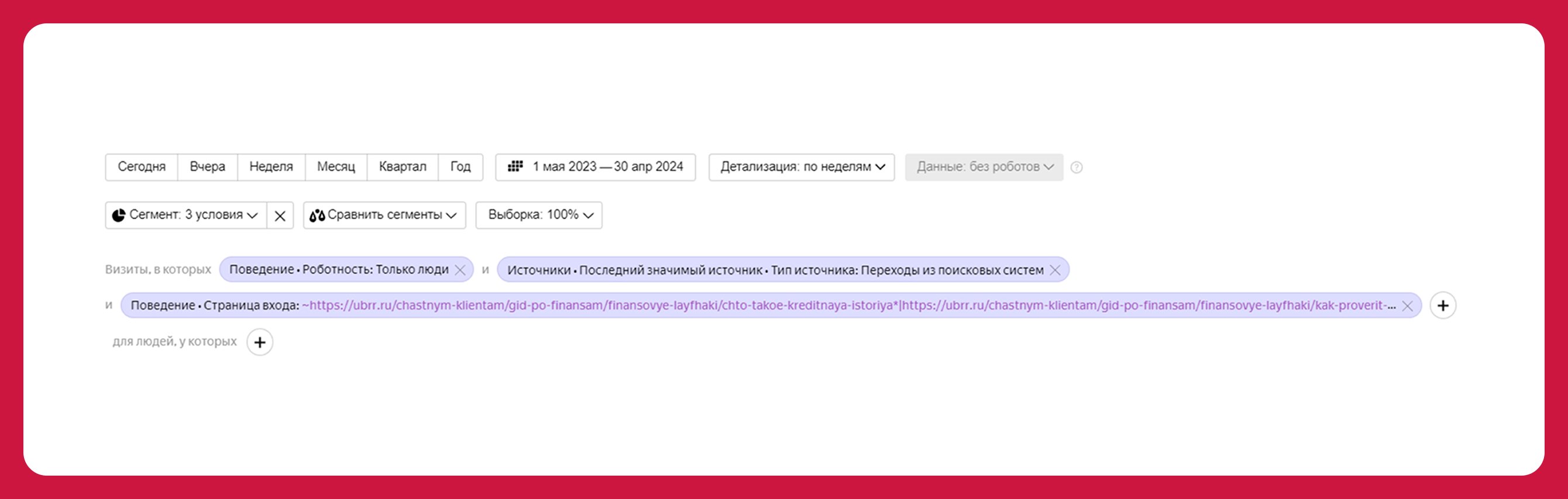 Иногда в течение месяца менеджерам по продукту могла понадобиться статистика. Они либо самостоятельно выставляли сложные фильтры в «Яндекс Метрике», либо обращались к нам.