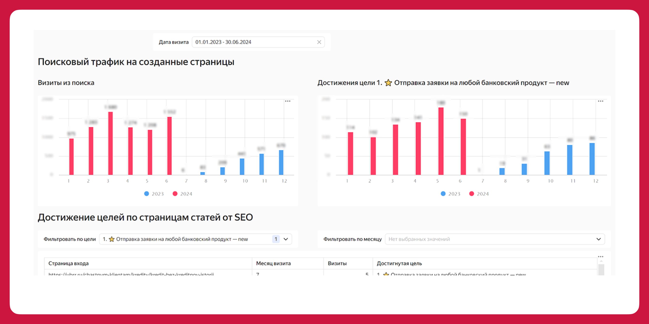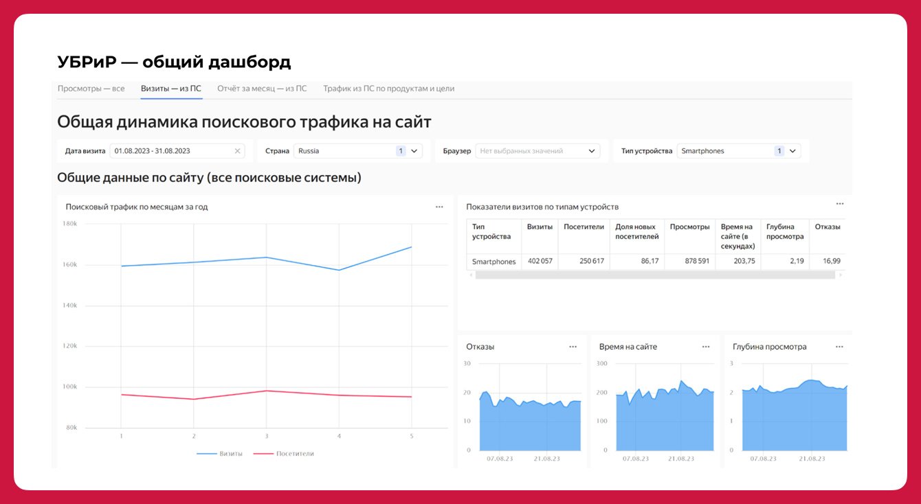 Кроме этого, наши оптимизаторы создали для клиента дашборд в Yandex DataLens, с помощью которого продуктовые команды могут быстро и удобно смотреть трафик только по своему продукту. А ещё провели вебинар для команды разработки банка с разбором типовых ошибок, которые затрудняют продвижение сайта в поиске.