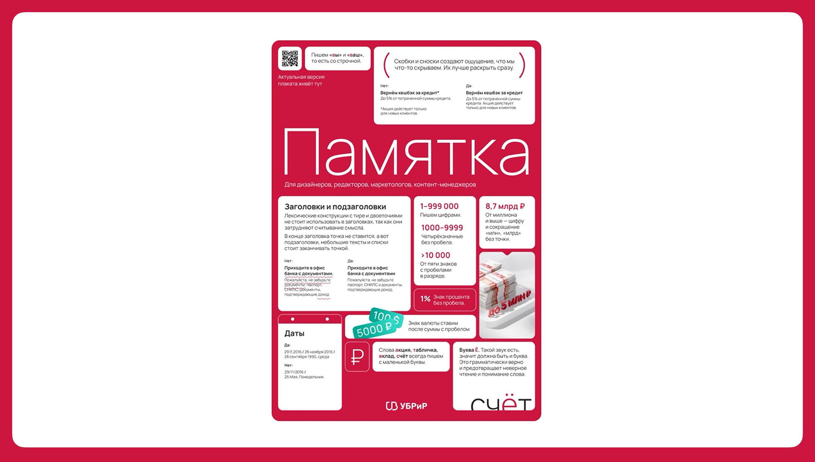 Улучшили тексты банка. На одной из встреч всплыла боль: дизайнеры получали длинные тексты, сложные для восприятия. В команде банка не было редактора, а нанять его клиент не мог. Переписывать тексты самим не было времени. Тогда мы придумали решение, чтобы привлечь внимание к проблеме: создали и повесили в офисе банка памятку с редполитикой.