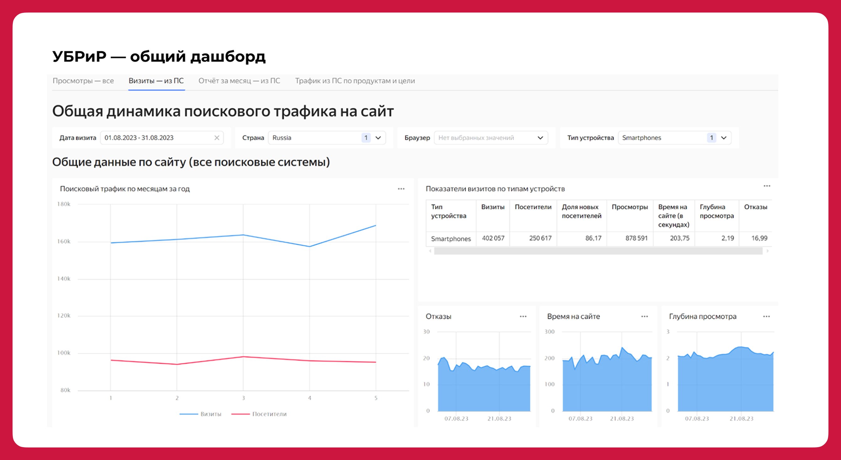 Создали дашборд для быстрого доступа к статистике. Первое время мы собирали отчёты по трафику для всех направлений вручную. Каждый месяц открывали «Яндекс Метрику», выставляли различные фильтры, чтобы посмотреть статистику по конкретному продукту, а потом сводили данные и переносили их в презентацию для клиента.
