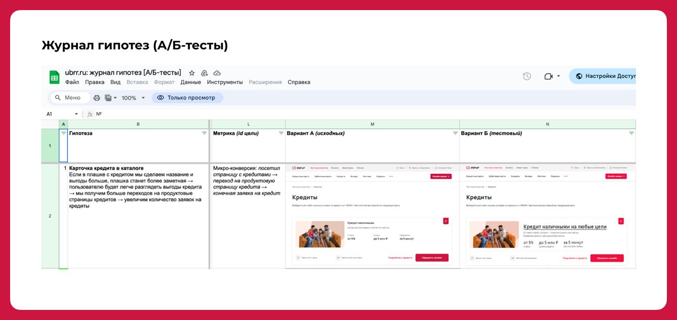 Журналом гипотез пользовались не только мы. Команда сайта клиента вовлеклась в процесс и предлагала свои идеи о повышении конверсии в заявку на продукты банка