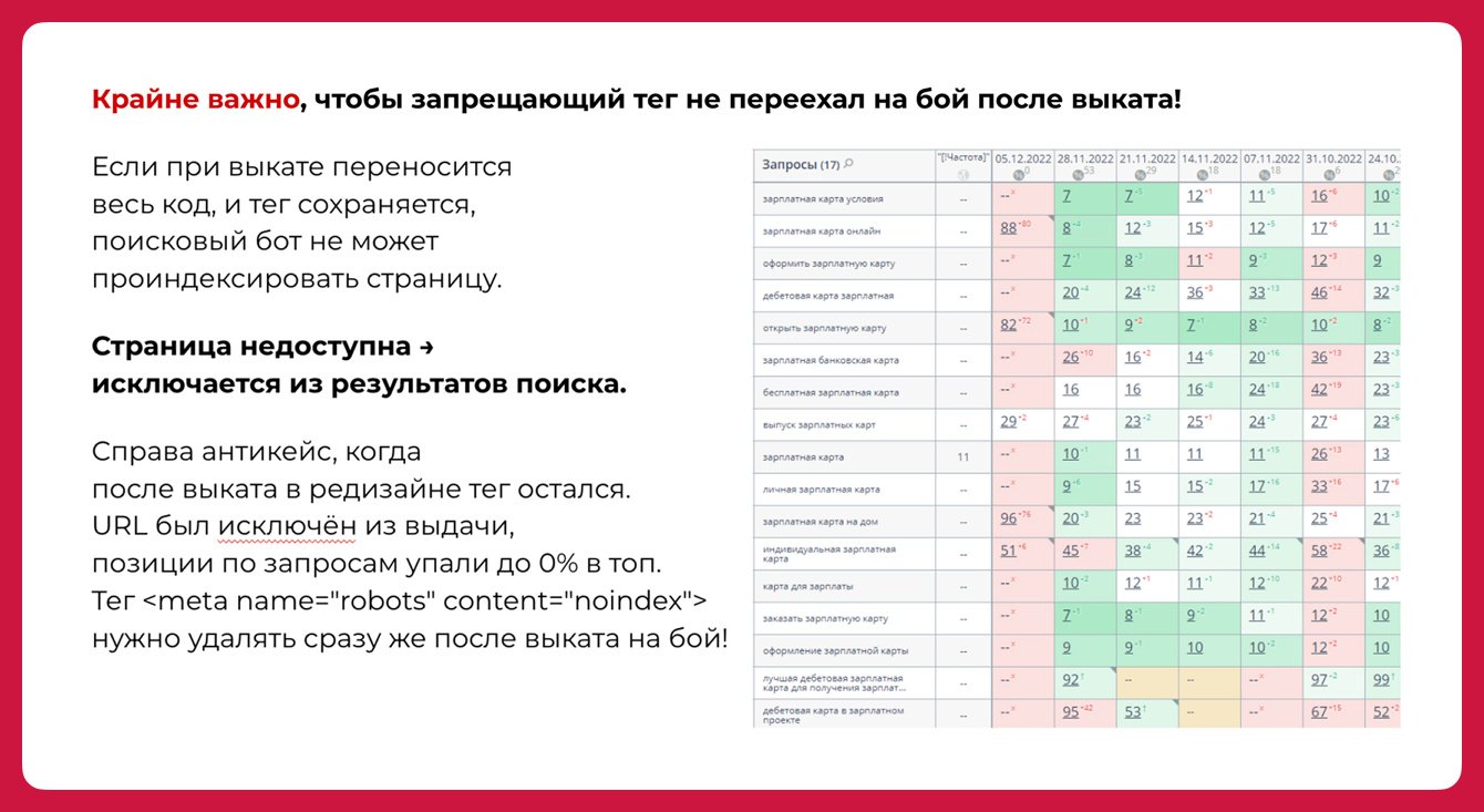 Чтобы все участники процесса понимали, что и зачем они делают, мы разобрали типовые задачи от SEO и провели вебинар для команды разработки банка. Так удалось сократить количество ошибок, которые влияют на SEO сайта, при внедрении срочных изменений.