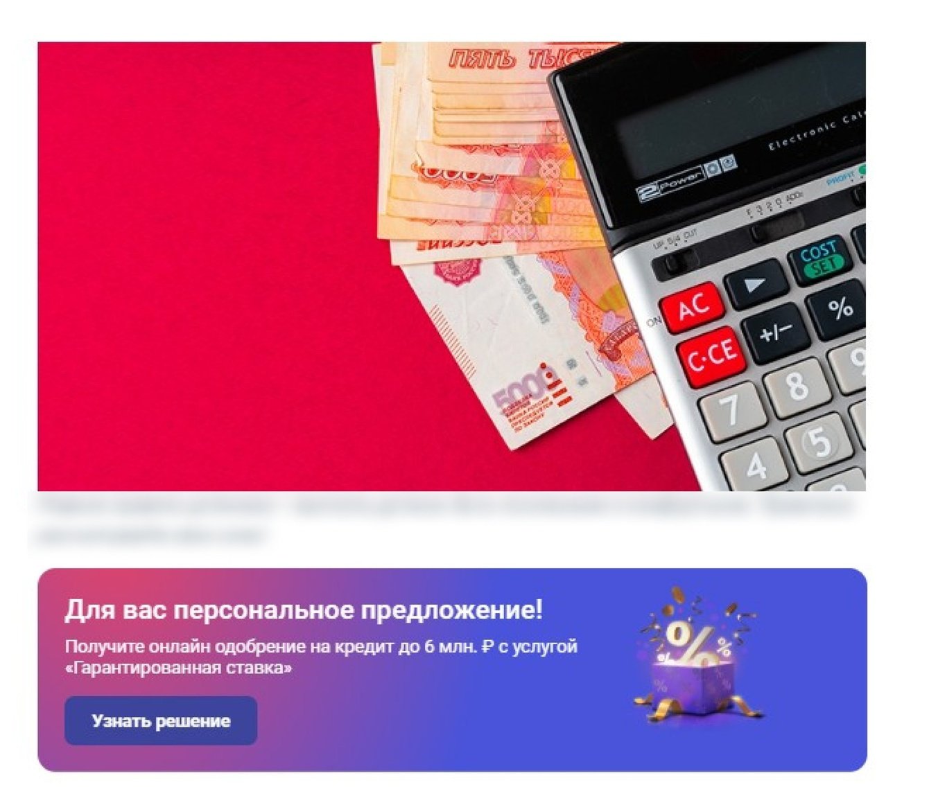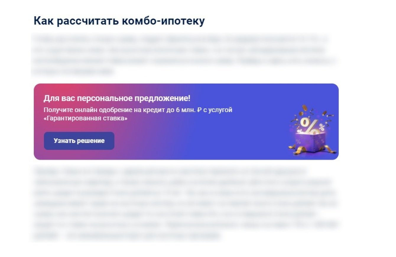 Пример виджета с CTA. Например, в статье «Что такое комбинированная ипотека» банк делает персональное предложение на кредит. CTA подобрано исходя из того, что человек, заинтересовавшийся такой статьёй, может нуждаться в кредите
