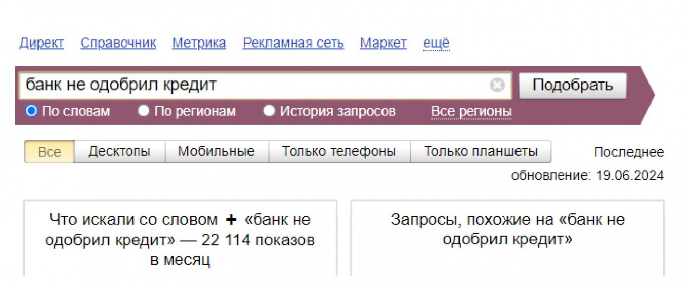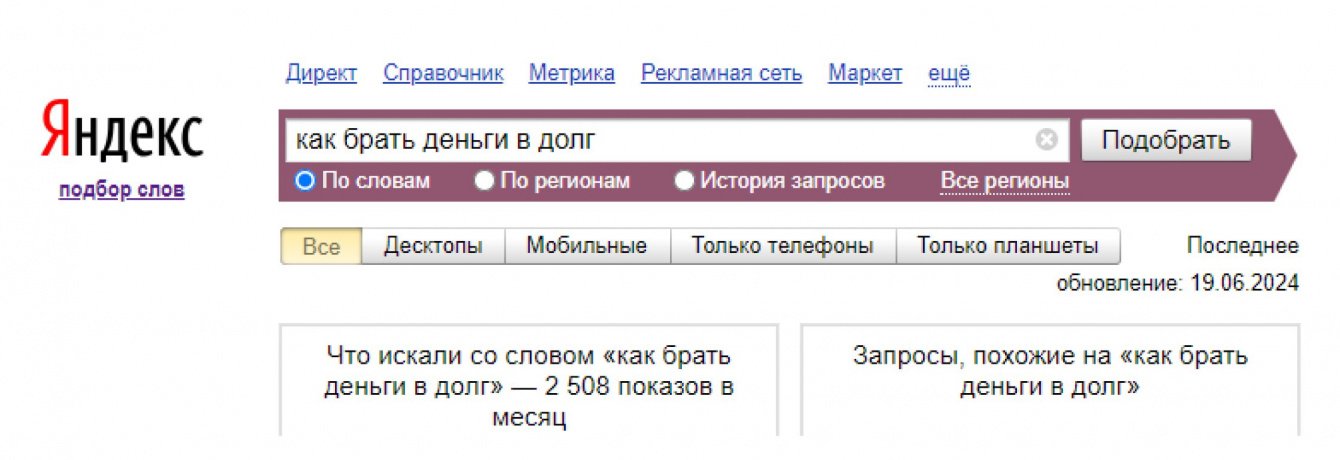 Чтобы избежать конкуренции, мы выбирали другие темы, например, «Как сделать так, чтобы банк одобрил кредит» или «Как брать деньги в долг. Правила и советы». Проверяли, чтобы по выбранной теме было достаточно информации и мы могли раскрыть её так, чтобы ответить на запрос пользователя. И чтобы тема была актуальной, так как клиенту было важно, чтобы написанные статьи были экспертными и помогали растить финансовую грамотность читателей.