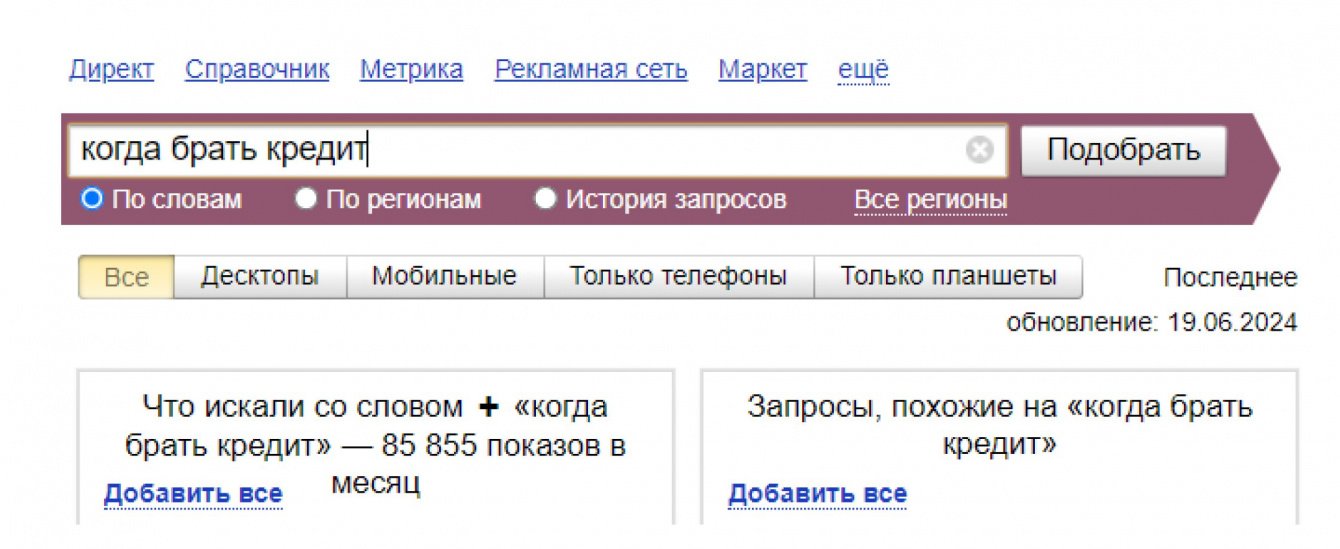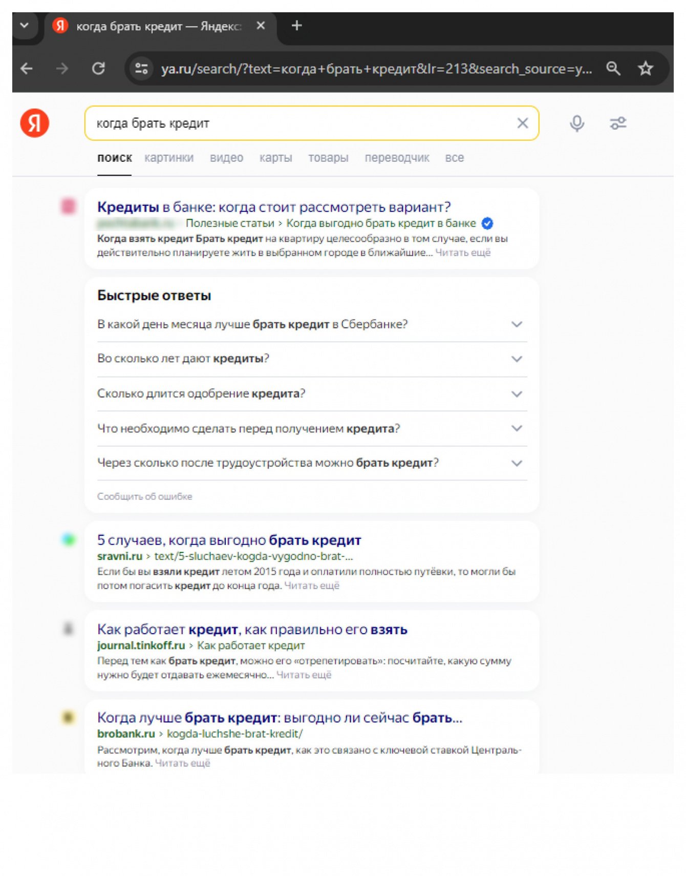 По высокочастотному запросу «когда брать кредит» статья клиента находится на первом месте выдачи