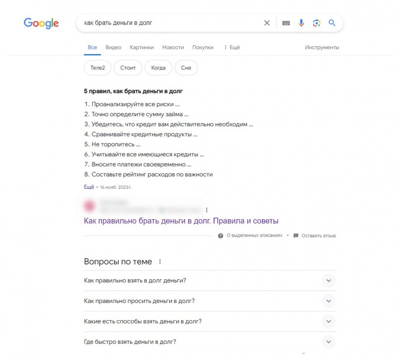 В Google статья клиента тоже находится на первом месте выдачи по информационному запросу «как брать деньги в долг»