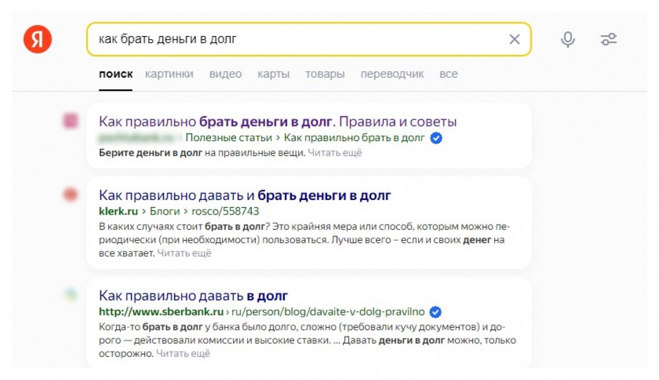 Ещё пример — по низкочастотному запросу «как брать деньги в долг» статья клиента первой выводится в поиске Яндекса