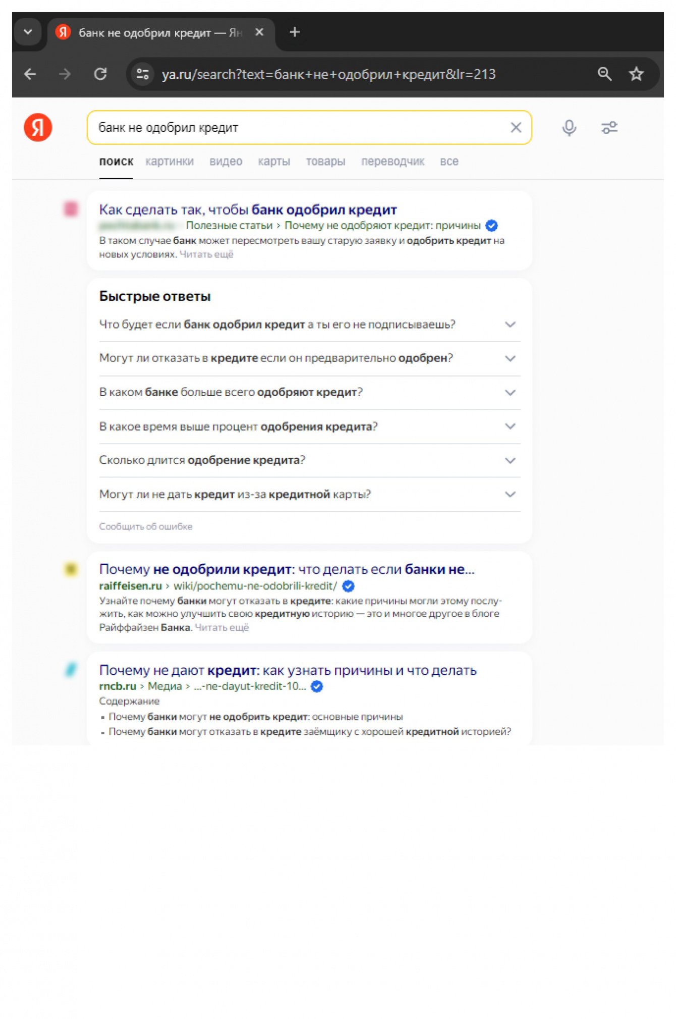 По менее частотному запросу «банк не одобрил кредит» статья клиента находится на первом месте в Яндексе