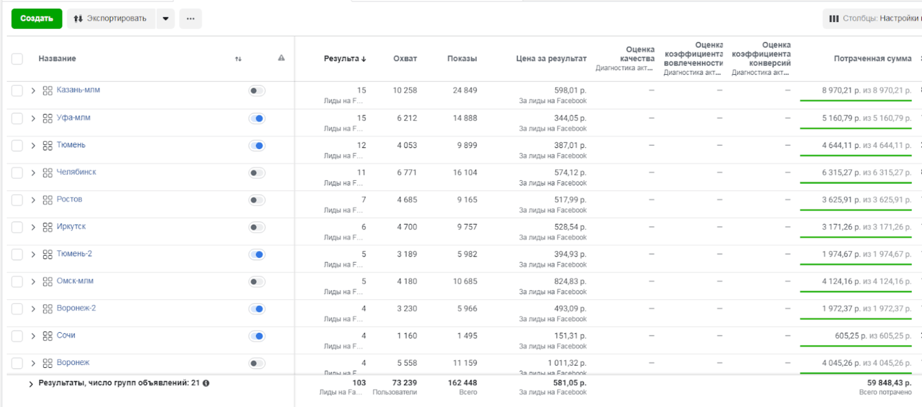 Локально настраивали объявления на каждый город в радиусе 8-10 км.