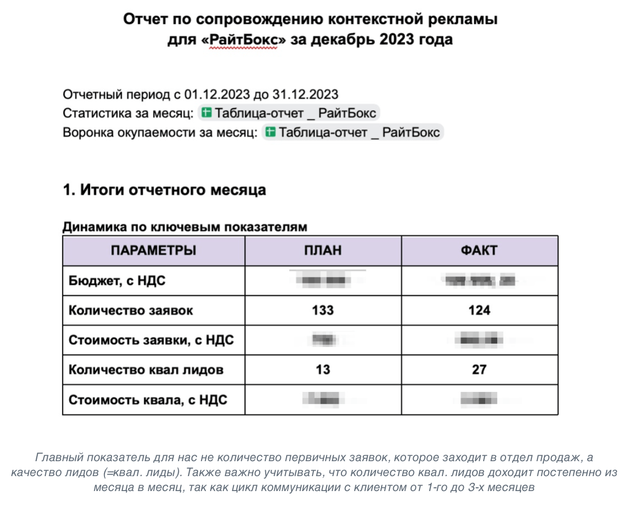 Каждый месяц делаем итоговый отчет о проделанной работе, полученных показателях и ставим план на следующий месяц по показателям и задачам, отталкиваясь от целей клиента по выручке и в целом по бизнесу.