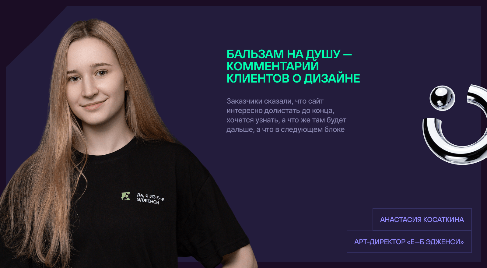 Один из любимых решений Насти — использование фотографий сотрудников. В блоке о процессах мы создали аватарки под каждый пункт в списке, а для экрана про знакомство с командой вырезали силуэты людей, чтобы разместить их на фирменном фоне и создать динамику. Такой живой контент разбавил обилие строгой графики и придал сайту дружелюбности и эмпатии.