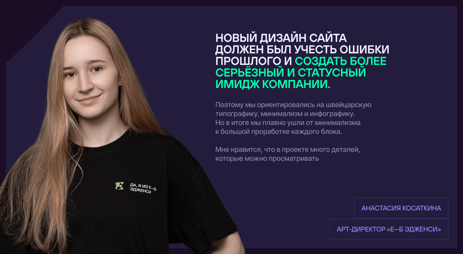 В процессе ребрендинга у компании появилась новая палитра с сиреневыми оттенками и неоновым зелёным. За основу мы решили взять тёмно-фиолетовый цвет, который позволил сделать дизайн более выдержанным, строгим и спокойным — как раз под характер контента. Клиенты были приятно удивлены таким решением, потому что после презентации брендинга ждали слишком ярких и даже ядовитых всплесков цветов, которых на сайте видеть не хотелось.